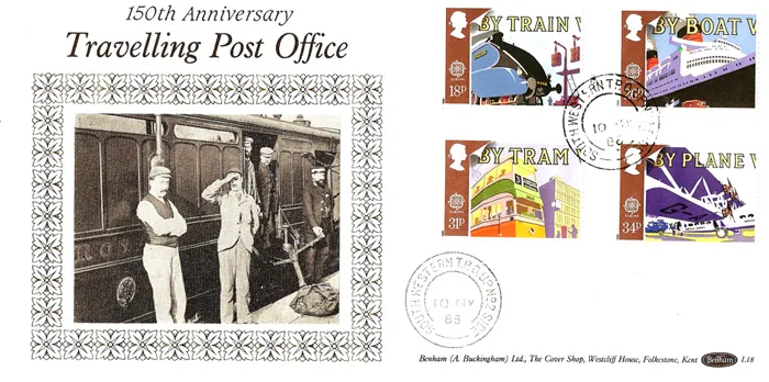 The above Royal Mail Transport were issued on 10 May 1988 by Royal Mail and feature the following stamp designs: 18p Mallard; 26p Queen Elizabeth; 31p Glasgow Tram; 34p Imperial Airways Handley Page. The Travelling Post Office first day cover with the South Western TPO Night Up, CDS Postmark postmark has been produced by Benham and features these stamps which can make a very collectible and lovely gift.