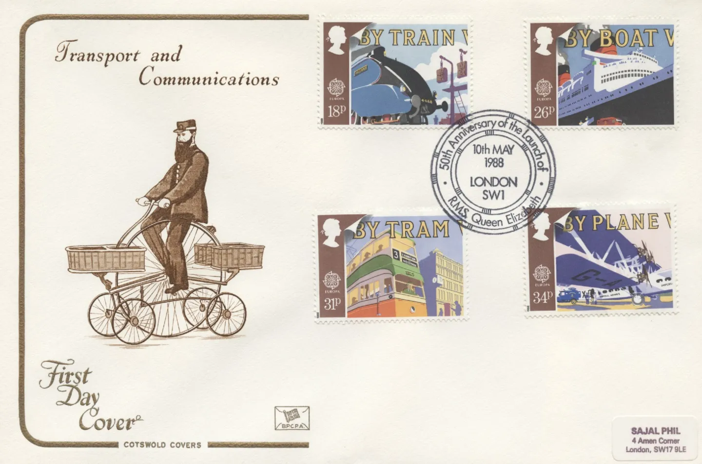 | Postmark: | Glasgow, London EC, York, Diss, London SW1, Rochester, Hythe, BFPS - Forces, Philatelic Bureau, National Postal Museum, Sheffield, Southampton, Ellon, Spilsby, New Museum of Transport, Special Handstamp, Lloyds of London Tercentenary, Special Handstamp, Rail Riders, Special Handstamp, The Jessop Collection, Special Handstamp, RMS Queen Elizabeth, Special Handstamp, Imperial Airways, Special Handstamp, Laser - 15 Years Service, Special Handstamp, Trans Atlantic Convoy, Special Handstamp, Aeroplane, Special Handstamp, Railways, Special Handstamp, Croydon Airport, Special Handstamp, Sheffield & Rotherham Railway, Special Handstamp, Tram - First Day of Issue, Special Handstamp, National Railway Museum - Mallard, Special Handstamp, Cinecosse - Tenth Anniversary, Special Handstamp, TGWU, Special Handstamp, 19th Century Post Box Discovery, Special Handstamp, Map of Air Routes, Special Handstamp |