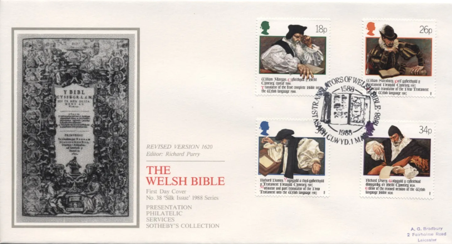 The above Royal Mail Welsh Bible were issued on 01 March 1988 by Royal Mail and feature the following stamp designs: 18p William Morgan; 26p William Salesbury; 31p Richard Davies; 34p Richard Parry. The The Revised Version 1620 first day cover with the Llanrhaeadr-Ym, Caernarfon, St. Asaph, Ty Mawr Wybrnant, Llansannan, St. Asaph, Special Handstamp, Castle, Special Handstamp, Special Handstamp, Special Handstamp, Birthplace of William Salesbury, CDS Postmark, Richard Parry, Bishop of St Asaph, CDS Postmark postmark has been produced by Pres. Philatelic Services and features these stamps which can make a very collectible and lovely gift.