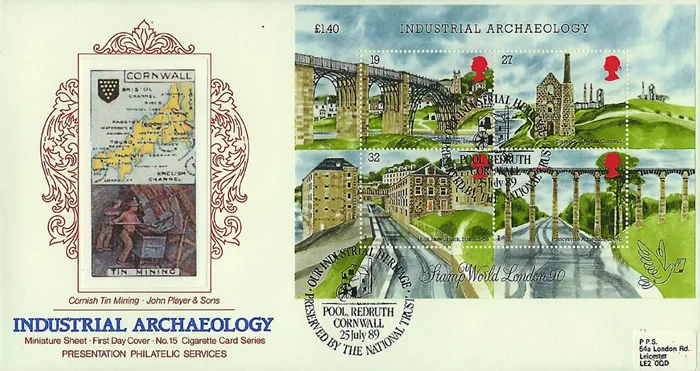 The above Royal Mail Industrial Archaeology: Miniature Sheet were issued on 25 July 1989 by Royal Mail and feature the following stamp designs: 19p Ironbridge; 27p St. Agnes; 32p New Lanark; 35p Pontcysyllte Aqueduct. The Tin Mining first day cover with the Pool Redruth, St. Agnes, National Trust, Special Handstamp, CDS Postmark postmark has been produced by Pres. Philatelic Services and features these stamps which can make a very collectible and lovely gift.