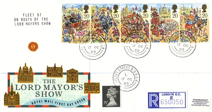 | Postmark: | Fleet Street, Buckingham Palace, Lombard Street, House of Lords, Redmarley, Leicester, London SW, House of Commons, Bath, Liverpool, on route of Lord Mayors Show, CDS Postmark, CDS Postmark, Birthplace of Dick Whittington, CDS Postmark, Aveling Barford depicting horse, Slogan Postmark, Autumn Stampex, Slogan Postmark, The Ministry of Defence, Slogan Postmark, is a Mechanised Letter Office, Slogan Postmark |