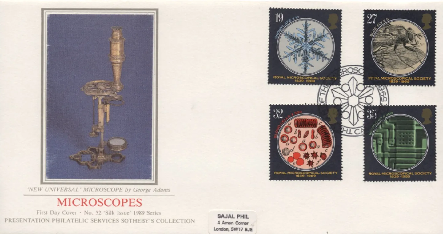 The above Royal Mail Microscopes were issued on 05 September 1989 by Royal Mail and feature the following stamp designs: 19p Snowflake; 27p Fly; 32p Blood; 35p Microchip. The New Universal Microscope first day cover with the Freshwater, Oxford, Cambridge, Aberdeen, House of Lords, Ipswich, House of Commons, Robert Hooke, Special Handstamp, Snowflake, Special Handstamp, Snowflake, Special Handstamp, North Sea Oil, Special Handstamp, CDS Postmark, Royal Hospital School, CDS Postmark, CDS Postmark postmark has been produced by Pres. Philatelic Services and features these stamps which can make a very collectible and lovely gift.