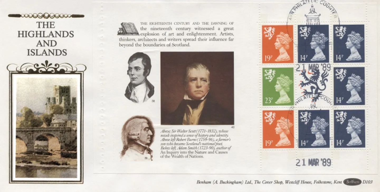 The above Royal Mail PSB: Scots - Pane 3 were issued on 21 March 1989 by Royal Mail and feature the following stamp designs: . The Scotland first day cover with the Ayr, Special Handstamp postmark has been produced by Benham and features these stamps which can make a very collectible and lovely gift.