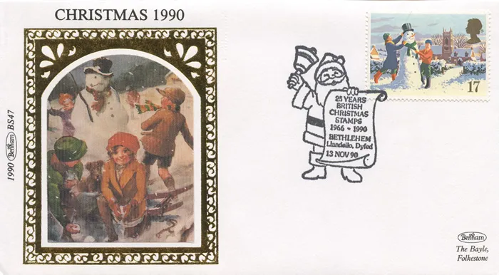 The above Royal Mail Christmas 1990 were issued on 13 November 1990 by Royal Mail and feature the following stamp designs: 17p Snowman; 22p Christmas Tree; 26p Carol Singers; 31p Tobogganing; 37p Skating. The Children and Snowman first day cover with the Bethlehem, 25 Years of British Christmas Stamps, Special Handstamp postmark has been produced by Benham and features these stamps which can make a very collectible and lovely gift.
