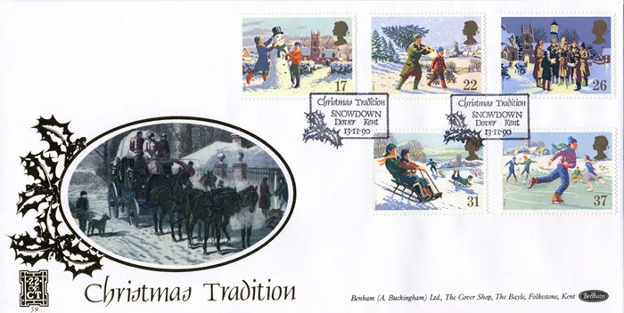 The above Royal Mail Christmas 1990 were issued on 13 November 1990 by Royal Mail and feature the following stamp designs: 17p Snowman; 22p Christmas Tree; 26p Carol Singers; 31p Tobogganing; 37p Skating. The Mailcoach in Winter first day cover with the Snowdown, Holly, Special Handstamp postmark has been produced by Benham and features these stamps which can make a very collectible and lovely gift.