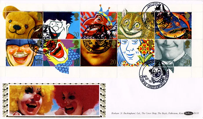 The above Royal Mail Smiles (Greetings) were issued on 06 February 1990 by Royal Mail and feature the following stamp designs: 20p Teddy; 20p Dennis the Menace; 20p Punch; 20p Cheshire Cat; 20p Man in the Moon; 20p Laughing Policeman; 20p Clown; 20p Mona Lisa; 20p Queen of Hearts; 20p Stan Laurel. The Clowns first day cover with the Clowne, Clown, Special Handstamp postmark has been produced by Benham and features these stamps which can make a very collectible and lovely gift.