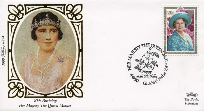 The above Royal Mail Queen Mother 90th Birthday were issued on 02 August 1990 by Royal Mail and feature the following stamp designs: 20p Queen Mother; 29p Queen Elizabeth; 34p Duchess of York; 37p Elizabeth Bowes-Lyon. The Duchess of York first day cover with the Glamis, Rose, Special Handstamp postmark has been produced by Benham and features these stamps which can make a very collectible and lovely gift.