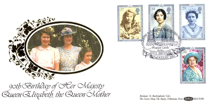 The above Royal Mail Queen Mother 90th Birthday were issued on 02 August 1990 by Royal Mail and feature the following stamp designs: 20p Queen Mother; 29p Queen Elizabeth; 34p Duchess of York; 37p Elizabeth Bowes-Lyon. The With Princesses Elizabeth & Margaret first day cover with the Windsor, Castle, Special Handstamp postmark has been produced by Benham and features these stamps which can make a very collectible and lovely gift.