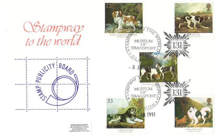 | Stamp Details: | 22p King Charles Spaniel 26p Pointer 31p Hounds 33p a Rough Dog 37p Fino and Tiny |