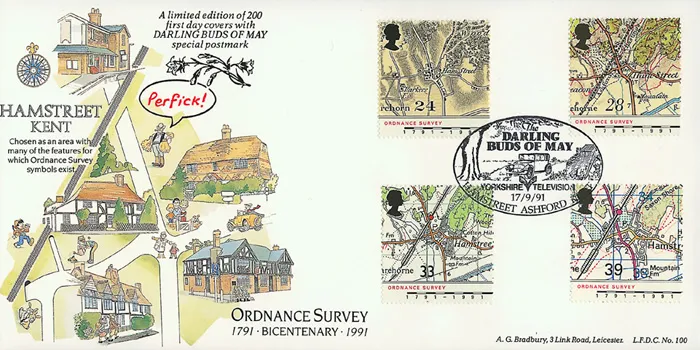 The above Royal Mail Maps - Ordnance Survey were issued on 17 September 1991 by Royal Mail and feature the following stamp designs: 24p Hamstreet map of 1816; 28p Hamstreet map of 1906; 33p Hamstreet map of 1959; 39p Hamstreet map of 1991. The Darling Buds of May first day cover with the Hamstreet, Special Handstamp postmark has been produced by Bradbury and features these stamps which can make a very collectible and lovely gift.