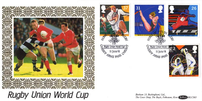 The above Royal Mail Student Games/Rugby Cup were issued on 11 June 1991 by Royal Mail and feature the following stamp designs: 22p Fencing; 26p Hurdling; 31p Diving; 39p Rugby. The Rugby Union World Cup first day cover with the Cardiff, Home of Welsh Rugby, Special Handstamp postmark has been produced by Benham and features these stamps which can make a very collectible and lovely gift.