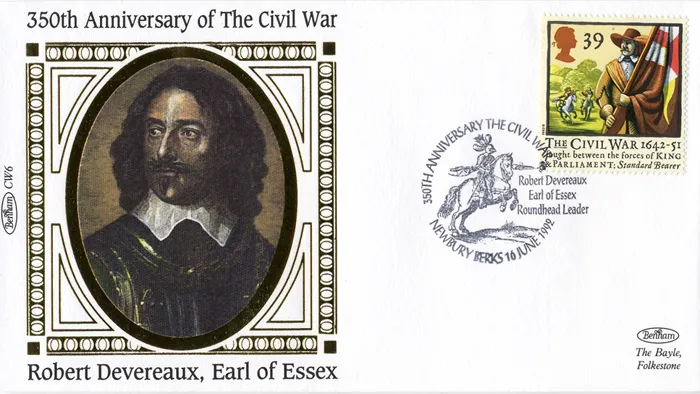 The above Royal Mail English Civil War were issued on 16 June 1992 by Royal Mail and feature the following stamp designs: 24p Pikeman; 28p Drummer; 35p Musketeer; 39p Standard Bearer. The Robert Devereaux, Earl of Essex first day cover with the Newbury, Robert Devereaux on horseback, Special Handstamp postmark has been produced by Benham and features these stamps which can make a very collectible and lovely gift.