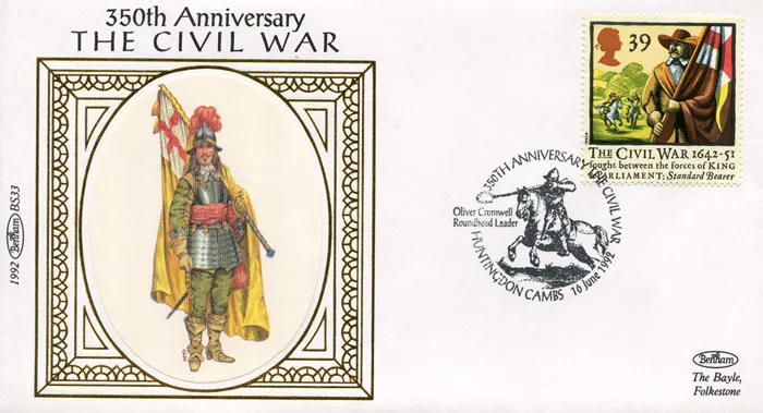 The above Royal Mail English Civil War were issued on 16 June 1992 by Royal Mail and feature the following stamp designs: 24p Pikeman; 28p Drummer; 35p Musketeer; 39p Standard Bearer. The Standard Bearer first day cover with the Huntingdon, Oliver Cromwell, Special Handstamp postmark has been produced by Benham and features these stamps which can make a very collectible and lovely gift.