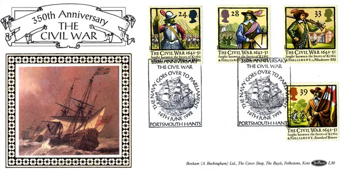 The above Royal Mail English Civil War were issued on 16 June 1992 by Royal Mail and feature the following stamp designs: 24p Pikeman; 28p Drummer; 35p Musketeer; 39p Standard Bearer. The The Navy Supports Parliament first day cover with the Portsmouth, The Navey Goes Over to Parliament, Special Handstamp postmark has been produced by Benham and features these stamps which can make a very collectible and lovely gift.