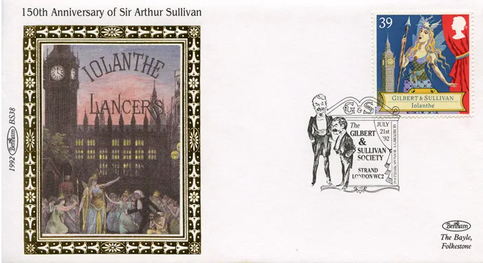 The above Royal Mail Gilbert & Sullivan were issued on 21 July 1992 by Royal Mail and feature the following stamp designs: 18p Yeoman of the Guard; 24p The Gondoliers; 28p The Mikado; 33p Pirates of Penzance; 39p Iolanthe. The Iolanthe first day cover with the London WC, The Gilbert & Sullivan Society, Special Handstamp postmark has been produced by Benham and features these stamps which can make a very collectible and lovely gift.