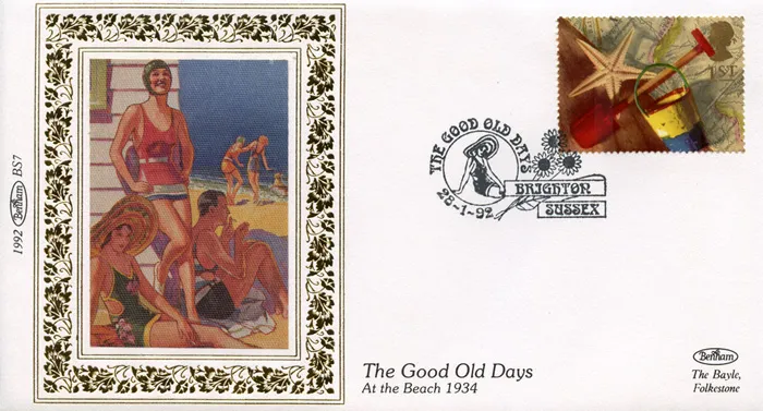 The above Royal Mail Memories (Greetings) were issued on 28 January 1992 by Royal Mail and feature the following stamp designs: 1st Lillies of the Valley; 1st Locket; 1st Key; 1st Model Car and Cigarette Cards; 1st Compass and Map; 1st Pocket Watch; 1st Penny Red; 1st Pearl Necklace; 1st Marbles; 1st Bucket and Spade. The At the beach first day cover with the Brighton, Girl in bathing costume, Special Handstamp postmark has been produced by Benham and features these stamps which can make a very collectible and lovely gift.