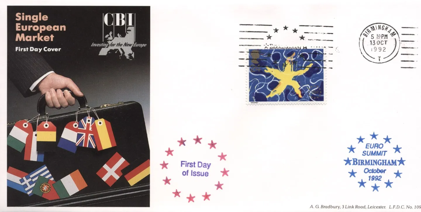 The above Royal Mail Single European Market were issued on 13 October 1992 by Royal Mail and feature the following stamp designs: 24p European flag by David Hockney. The CBI first day cover with the London, London, London, Birmingham, CBI, Special Handstamp, Special Handstamp, Visaservice Passports, Slogan Postmark, EuroSummit, Slogan Postmark postmark has been produced by Bradbury and features these stamps which can make a very collectible and lovely gift.