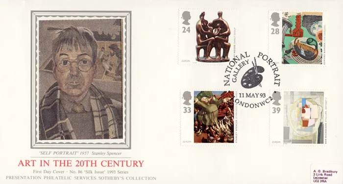 The above Royal Mail 20th Century Art were issued on 11 May 1993 by Royal Mail and feature the following stamp designs: 24p Henry Moore; 28p Edward Bawden; 33p Stanley Spencer; 39p Ben Nicholson. The Self Portrait Stanley Spencer first day cover with the London, Kew Gardens, Albermarle St, Trafalgar Square, Leeds, Cookham, The Galleries, National Portrait Gallery, Special Handstamp, CDS Postmark, Nearest PO to the Royal Academy, CDS Postmark, CDS Postmark, Henry Moore, Special Handstamp, Stanley Spencer, Special Handstamp, CDS Postmark postmark has been produced by Pres. Philatelic Services and features these stamps which can make a very collectible and lovely gift.