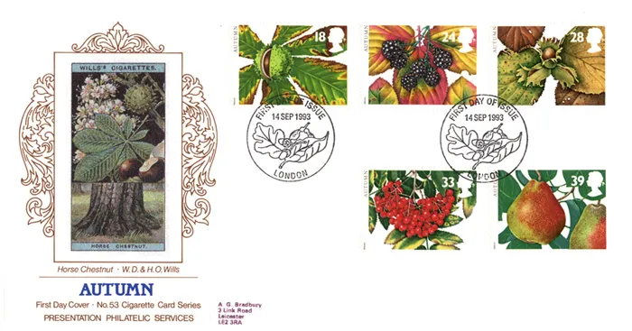 The above Royal Mail 4 Seasons: Autumn were issued on 14 September 1993 by Royal Mail and feature the following stamp designs: 18p Horse Chestnut; 24p Blackberry; 28p Hazel Nut; 33p Mountain Ash; 39p Pear. The Horse Chestnut first day cover with the London, Pershore, Special Handstamp, CDS Postmark postmark has been produced by Pres. Philatelic Services and features these stamps which can make a very collectible and lovely gift.
