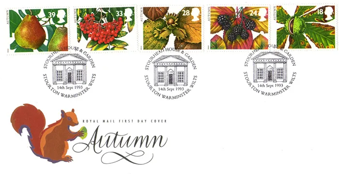 | Postmark: | Cherry Tree, Botanic Gardens, Mountain Ash, Plantation, Hazel Grove, Stourton, Philatelic Bureau, Taunton, Berry Hill, Hazelwood, Nutfield, London, Pear Tree, Peterborough, Beeston, Cannock, The Orchards, House of Lords, CDS Postmark, Belfast, CDS Postmark, Stourhead House and Gardens, Special Handstamp, First Day of Issue - Tree in Autumn, Special Handstamp, First Day of Issue - Bowl of Fruit, Special Handstamp, Blackberries, Special Handstamp, Hazel leaves and nuts, Special Handstamp, Autumn Leaves, Special Handstamp, First Day of Issue - Autunm Leaves, Special Handstamp, NVRlys - Wansford Station, Special Handstamp, Woodside Road, CDS Postmark, Hazelslade, CDS Postmark |