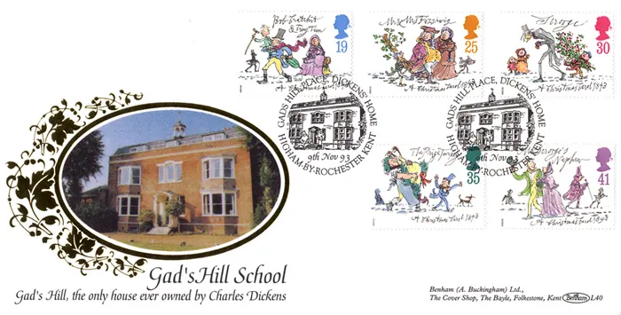 The above Royal Mail Christmas 1993 were issued on 09 November 1993 by Royal Mail and feature the following stamp designs: 19p Bob Cratchit and Tiny Tim; 25p Mr and Mrs Fezziwig; 30p Scrooge; 35p The Prize Turkey; 41p Mr Scrooge's Nephew. The Gad's Hill School first day cover with the Rochester, Gads Hill Place - Dickens' Home, Special Handstamp postmark has been produced by Benham and features these stamps which can make a very collectible and lovely gift.
