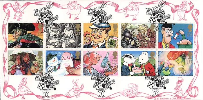 | Stamp Details: | 1st Long John Silver 1st Tweedledee and Tweedledum 1st Just William 1st Toad & Mole 1st Bash Street Kids 1st Peter Rabbit 1st Snowman 1st Big Friendly Giant 1st Rupert Bear 1st Aladdin and Genie |