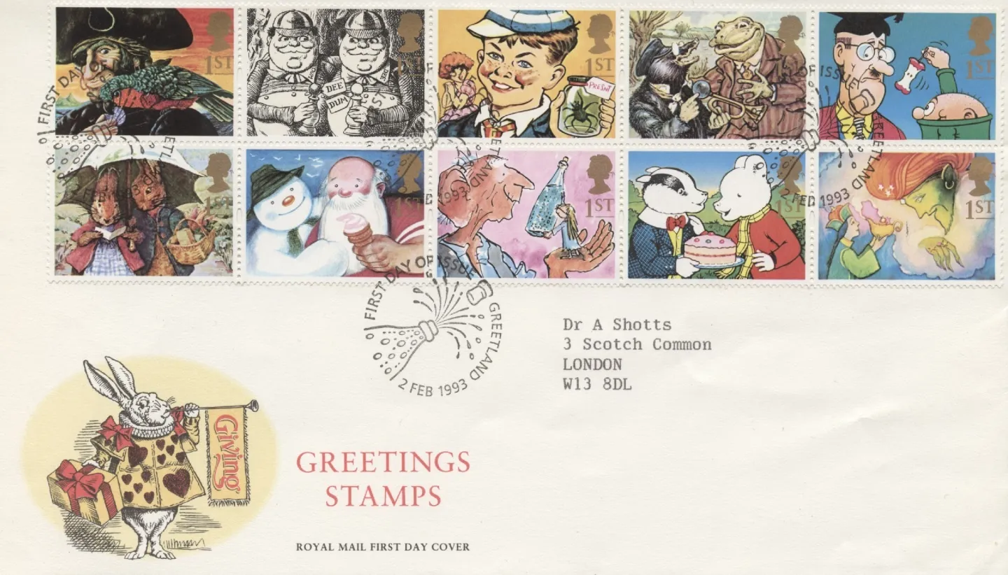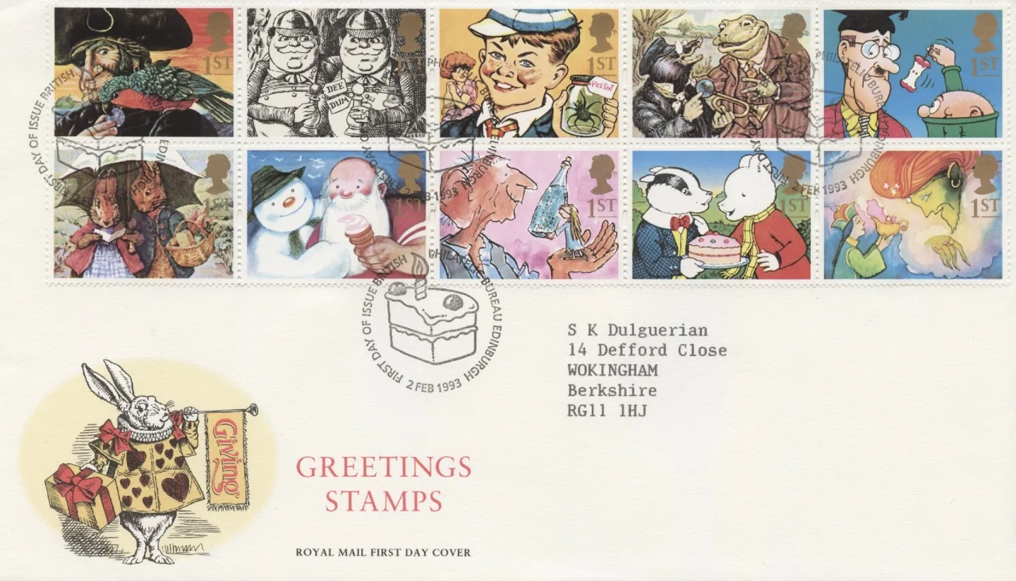 | Stamp Details: | 1st Long John Silver 1st Tweedledee and Tweedledum 1st Just William 1st Toad & Mole 1st Bash Street Kids 1st Peter Rabbit 1st Snowman 1st Big Friendly Giant 1st Rupert Bear 1st Aladdin and Genie |