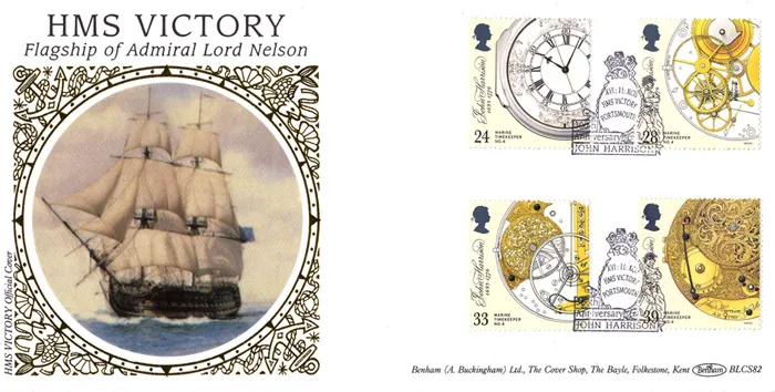 The above Royal Mail Maritime Clocks were issued on 16 February 1993 by Royal Mail and feature the following stamp designs: 24p, 28p, 33p, 39p four layers of Harrison's H4 clock. The Nelson's Victory first day cover with the Portsmouth, HMS Victory, Special Handstamp postmark has been produced by Benham and features these stamps which can make a very collectible and lovely gift.