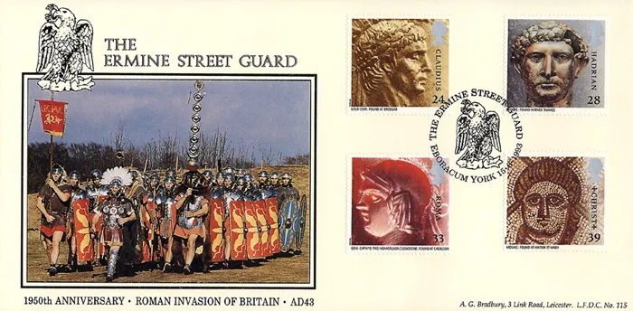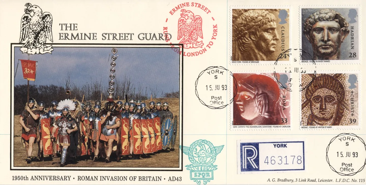 The above Royal Mail Roman Britain were issued on 15 June 1993 by Royal Mail and feature the following stamp designs: 24p Gold Coin (Claudius); 28p Bronze Head (Hadrian); 33p Gemstone (Goddess Roma); 39p Mosaic (Christ). The Ermine Street Guard first day cover with the York, York, York, York, The Ermine Street Guard, Special Handstamp, The Ermine Street Guard, Special Handstamp, CDS Postmark, The Ermine Street Guard, Special Handstamp postmark has been produced by Bradbury and features these stamps which can make a very collectible and lovely gift.