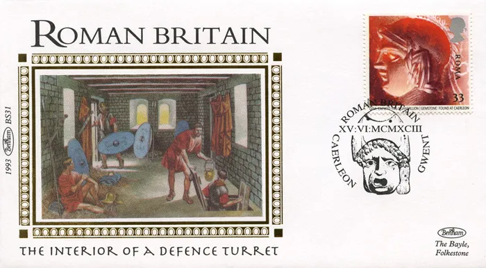 The above Royal Mail Roman Britain were issued on 15 June 1993 by Royal Mail and feature the following stamp designs: 24p Gold Coin (Claudius); 28p Bronze Head (Hadrian); 33p Gemstone (Goddess Roma); 39p Mosaic (Christ). The Interior of a Defence Turret first day cover with the Caerleon, Face mask, Special Handstamp postmark has been produced by Benham and features these stamps which can make a very collectible and lovely gift.