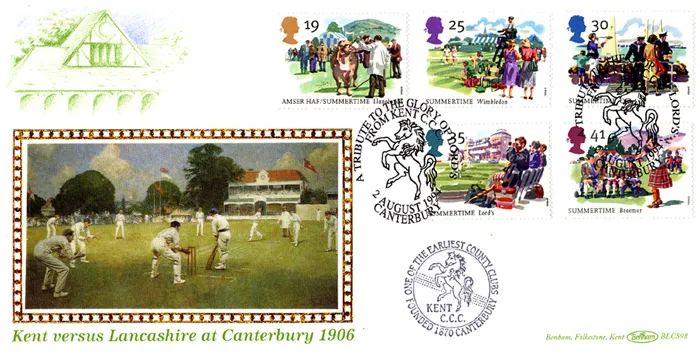 The above Royal Mail 4 Seasons: Summer were issued on 02 August 1994 by Royal Mail and feature the following stamp designs: 19p Welsh Show; 25p Wimbledon; 30p Cowes; 35p Lords; 41p Braemar Highland Gathering. The Kent v. Lancashire at Canterbury first day cover with the Canterbury, Tribute to the Glory of Lords, Special Handstamp postmark has been produced by Benham and features these stamps which can make a very collectible and lovely gift.