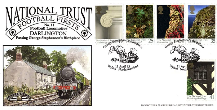 The above Royal Mail National Trust were issued on 11 April 1995 by Royal Mail and feature the following stamp designs: 19p 100 Years; 25p Protecting Land; 30p Conserving Art; 35p Saving Coast; 41p Buildings. The George Stephenson's Birthplace first day cover with the Wylam, George Stephenson's Birthplace, Special Handstamp postmark has been produced by Dawn and features these stamps which can make a very collectible and lovely gift.