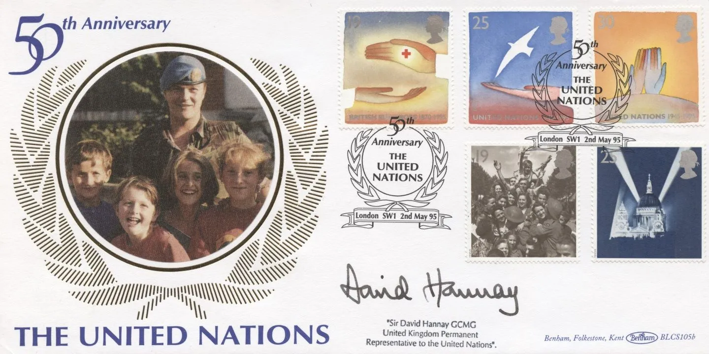 The above Royal Mail Peace and Freedom were issued on 02 May 1995 by Royal Mail and feature the following stamp designs: 19p Liberation of Paris; 25p St. Paul's VE night; 19p Red Cross; 25p & 30p United Nations. The UN Signed Cover first day cover with the London SW1, Special Handstamp postmark has been produced by Benham and features these stamps which can make a very collectible and lovely gift.