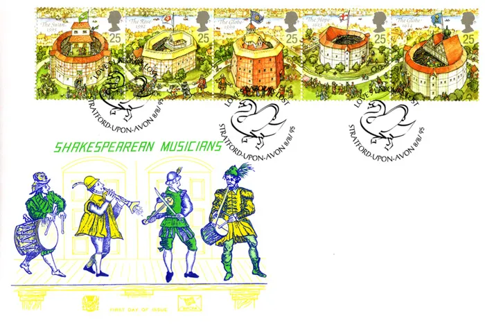 | Stamp Details: | 25p The Swan (c.1595) 25p The Rose(c.1592) 25p The Globe (c.1599) 25p The Hope (c.1613) 25p The Globe (c.1614) |