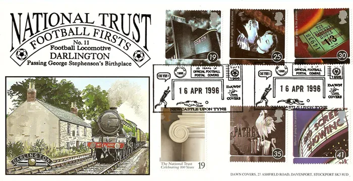 The above Royal Mail Cinema Centenary were issued on 16 April 1996 by Royal Mail and feature the following stamp designs: 19p Harrogate Odeon; 25p The Screen Kiss; 30p Cinema ticket; 35p Pathe; 41p Manchester Odeon. The George Stephenson's Birthplace first day cover with the Newcastle, Oh Yes!, Special Handstamp postmark has been produced by Dawn and features these stamps which can make a very collectible and lovely gift.