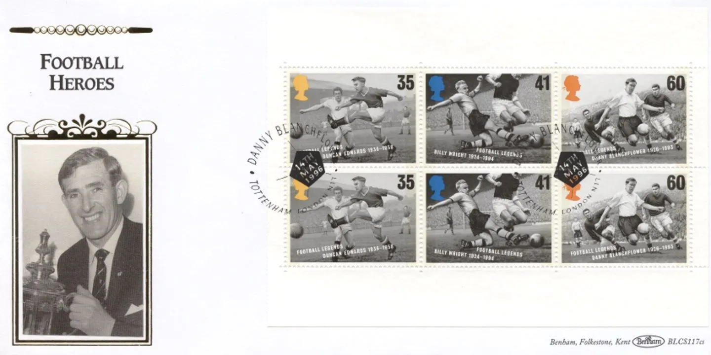 The above Royal Mail PSB: Football - Pane 3 were issued on 14 May 1996 by Royal Mail and feature the following stamp designs: . The Danny Blanchflower first day cover with the Tottenham, Special Handstamp postmark has been produced by Benham and features these stamps which can make a very collectible and lovely gift.