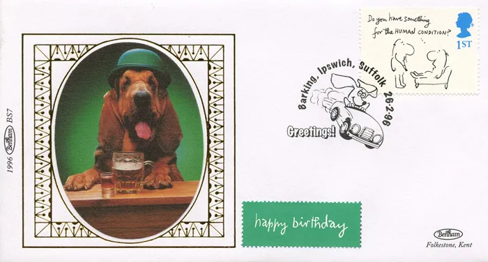 The above Royal Mail Cartoons (Greetings) were issued on 26 February 1996 by Royal Mail and feature the following stamp designs: 1st More Love; 1st Sincerely; 1st Human Condition; 1st Mental Floss; 1st 4.55 PM; 1st Dear Lottery Prize Winner; 1st I'm writing to you because; 1st Fetch this, fetch that; 1st My day starts before I'm ready for it; 1st The Cheque in the Post. The Hound at bar with pint first day cover with the Barking, Dog driving car, Special Handstamp postmark has been produced by Benham and features these stamps which can make a very collectible and lovely gift.