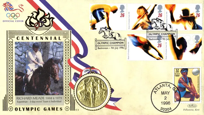 The above Royal Mail Olympic Games 1996 were issued on 09 July 1996 by Royal Mail and feature the following stamp designs: 26p Athlete; 26p Javelin; 26p Basketball; 26p Swimming; 26p Athlete and Olympic Rings. The Richard Meade first day cover with the Badminton, Show Jumper, Special Handstamp postmark has been produced by Benham and features these stamps which can make a very collectible and lovely gift.
