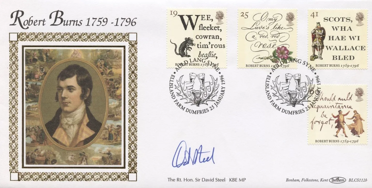 The above Royal Mail Robert Burns Bicentenary were issued on 25 January 1996 by Royal Mail and feature the following stamp designs: 19p To a Mouse; 25p O my Luve's like a red, red rose; 41p Scots, wha hae; 60p Auld Lang Syne. The Signed cover first day cover with the Dumfries, Special Handstamp postmark has been produced by Benham and features these stamps which can make a very collectible and lovely gift.