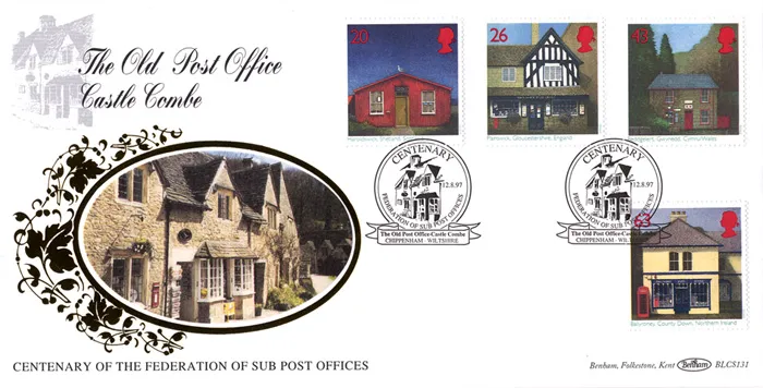 The above Royal Mail Sub-Post Offices were issued on 12 August 1997 by Royal Mail and feature the following stamp designs: 20p Haroldswick Shetland; 26p Painswick Gloucestershire; 43p Beddgelert Gwynedd; 63p Ballyroney County Down. The Old Post Office - Castle Combe first day cover with the Chippenham, The Old Post Office Castle Combe, Special Handstamp postmark has been produced by Benham and features these stamps which can make a very collectible and lovely gift.