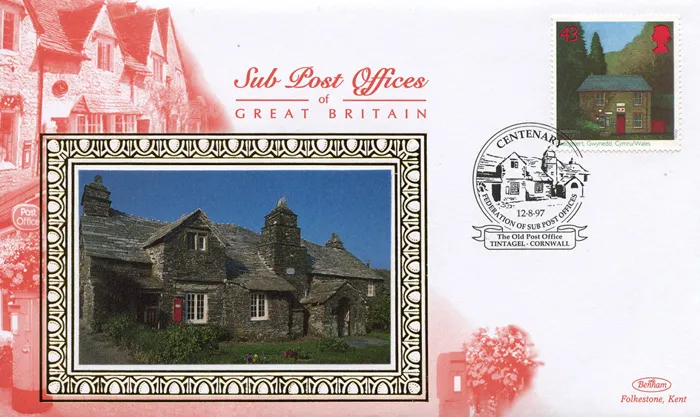 The above Royal Mail Sub-Post Offices were issued on 12 August 1997 by Royal Mail and feature the following stamp designs: 20p Haroldswick Shetland; 26p Painswick Gloucestershire; 43p Beddgelert Gwynedd; 63p Ballyroney County Down. The Tintagel Post Office first day cover with the Tintagel, The Old Post Office, Special Handstamp postmark has been produced by Benham and features these stamps which can make a very collectible and lovely gift.