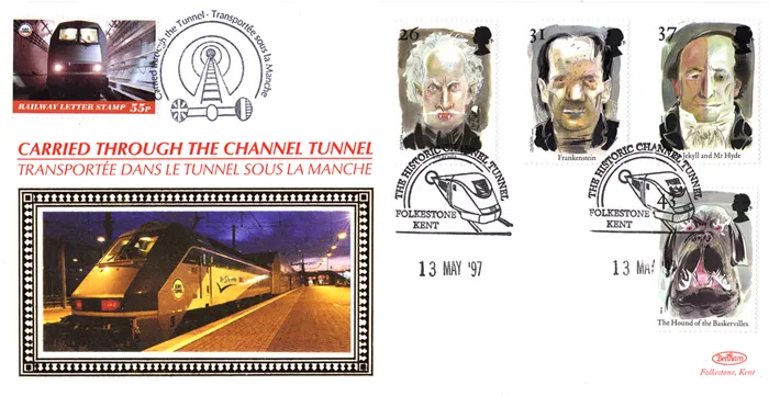 The above Royal Mail Tales of Terror were issued on 13 May 1997 by Royal Mail and feature the following stamp designs: 26p Dracula; 31p Frankenstein; 37p Dr Jekyll and Mr Hyde; 43p The Hound of the Baskervilles. The Channel Tunnel first day cover with the Folkestone, Historic Channel Tunnel, Special Handstamp postmark has been produced by Benham and features these stamps which can make a very collectible and lovely gift.