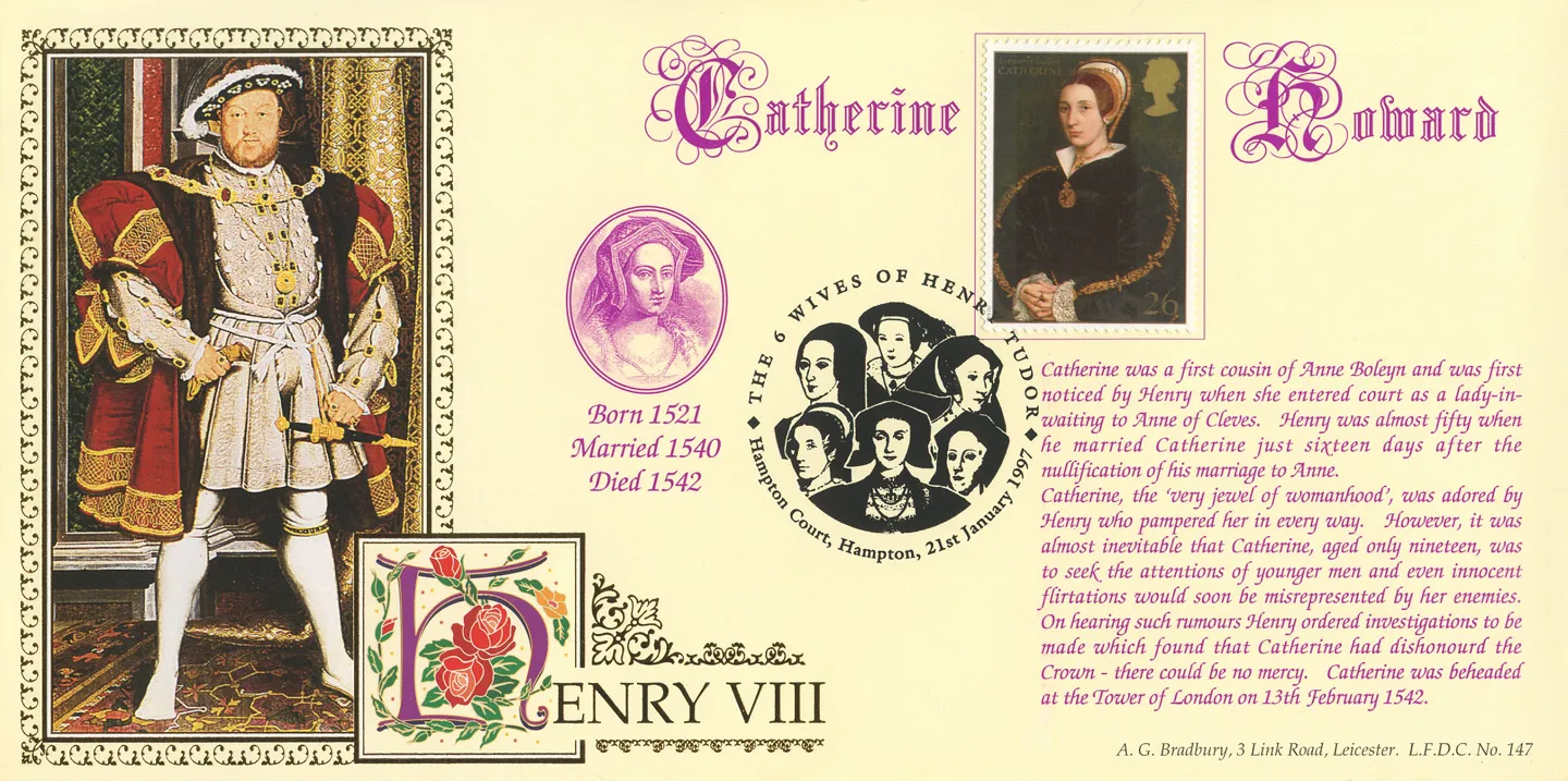 The above Royal Mail The Great Tudor were issued on 21 January 1997 by Royal Mail and feature the following stamp designs: 26p Henry VIII; 26p Catherine of Aragon; 26p Anne Boleyn; 26p Jane Seymour; 26p Anne of Cleves; 26p Catherine Howard; 26p Catherine Parr. The Catherine Howard first day cover with the Hampton Court, Henry & his six wives, Special Handstamp postmark has been produced by Bradbury and features these stamps which can make a very collectible and lovely gift.