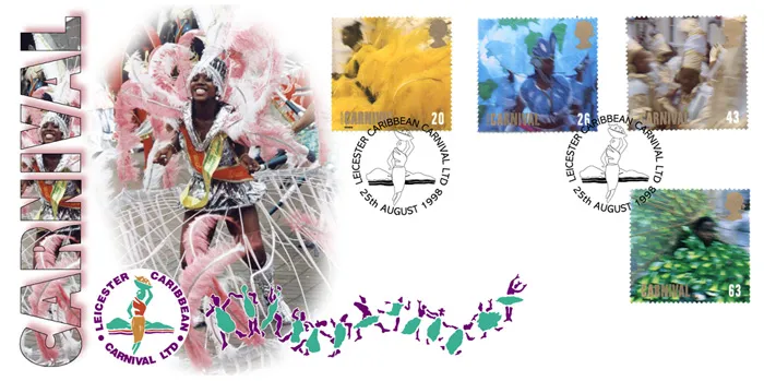 The above Royal Mail Carnivals were issued on 25 August 1998 by Royal Mail and feature the following stamp designs: 20p, 26p, 43p, 63p Notting Hill Carnival. The Leicester Caribbean Carnival first day cover with the Leicester, Leicester, Leicester, Leicester, Carribean Carnival, Special Handstamp, Carribean Carnival, Special Handstamp, CDS Postmark, Carribean Carnival, Special Handstamp postmark has been produced by Bradbury and features these stamps which can make a very collectible and lovely gift.
