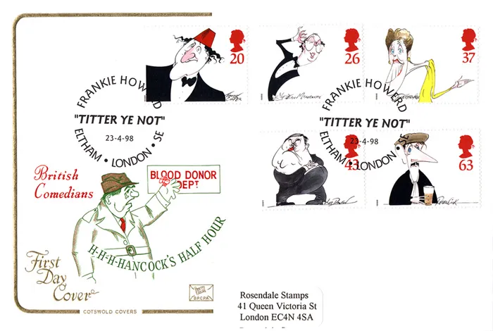 | Stamp Details: | 20p Tommy Cooper 26p Eric Morecambe 37p Joyce Grenfell 43p Les Dawson 63p Peter Cook |