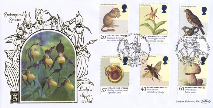 The above Royal Mail Endangered Species were issued on 20 January 1998 by Royal Mail and feature the following stamp designs: 20p Dormouse; 26p Orchid; 31p Song Thrush; 37p Snail; 43p Cricket; 63p Fungi. The Lady's Slipper Orchid first day cover with the Kew, Lady's Slipper Orchid, Special Handstamp postmark has been produced by Benham and features these stamps which can make a very collectible and lovely gift.
