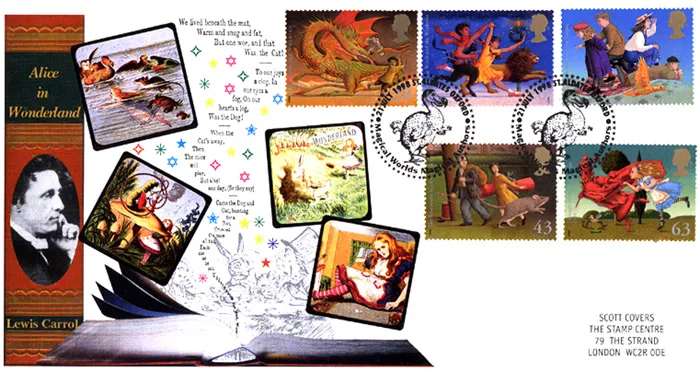 The above Royal Mail Magical Worlds were issued on 21 July 1998 by Royal Mail and feature the following stamp designs: 20p The Hobbit; 26p The Lion, the Witch and the Wardrobe; 37p The Phoenix and the Carpet; 43p The Borrowers; 63p Through the Looking Glass. The Alice in Wonderland first day cover with the Oxford, Magical Authors St. Aldates, Special Handstamp postmark has been produced by Steven Scott and features these stamps which can make a very collectible and lovely gift.