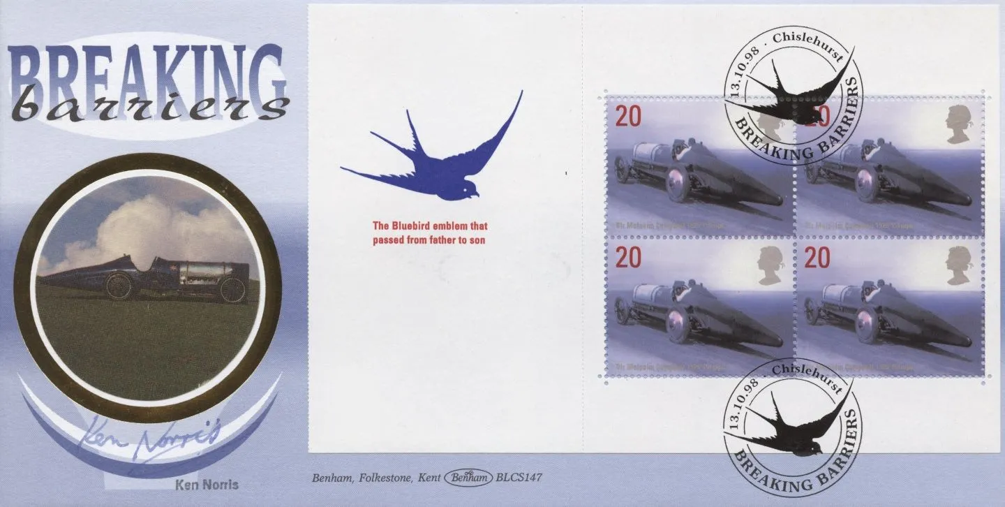 The above Royal Mail PSB: Speed were issued on 13 October 1998 by Royal Mail and feature the following stamp designs: . The Ken Norris signed first day cover with the Chislehurst, Special Handstamp postmark has been produced by Benham and features these stamps which can make a very collectible and lovely gift.
