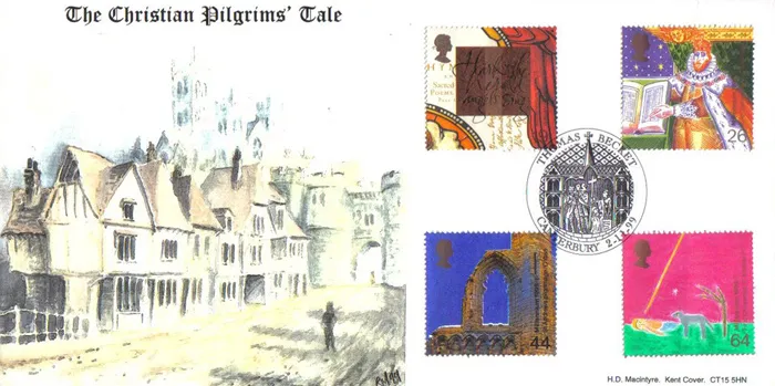 The above Royal Mail Christians' Tale were issued on 02 November 1999 by Royal Mail and feature the following stamp designs: 19p Wesley; 26p King James Bible; 44p St. Andrew's Pilgrimage; 64p First Christmas. The Christian Pilgrims' Tale first day cover with the Canterbury, Thomas Beckett, Special Handstamp postmark has been produced by H Macintyre and features these stamps which can make a very collectible and lovely gift.