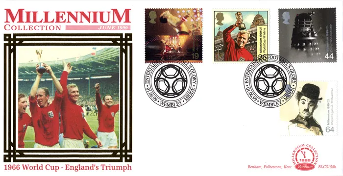 The above Royal Mail Entertainers' Tale were issued on 01 June 1999 by Royal Mail and feature the following stamp designs: 19p Freddie Mercury; 26p 1966 World Cup; 44p Doctor Who; 64p Charlie Chaplin. The 1966 World Cup first day cover with the Wembley, Football's Glory, Special Handstamp postmark has been produced by Benham and features these stamps which can make a very collectible and lovely gift.